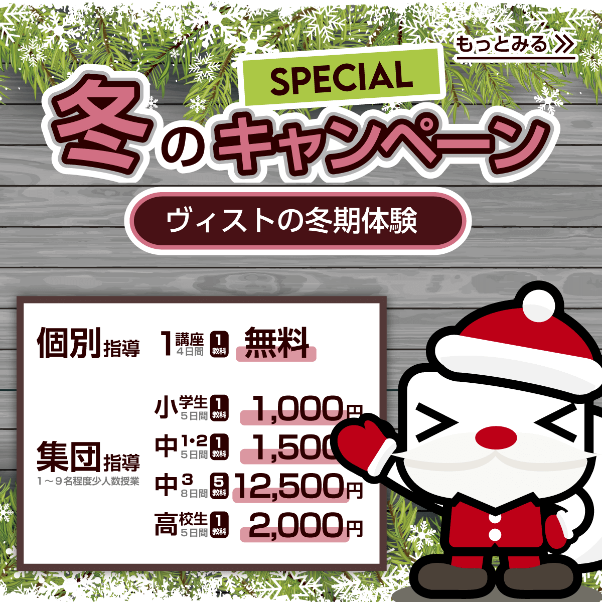 ヴィストでは、これからを担う若者こそが最も大切な財産であり、こども達には出来る限りのチャンスを差し上げたいと心から考えています。学ぶ機会と環境、そして有意義な学びの時間を最大限に提供していくことが、こども達の可能性を広げ、大きく羽ばたく将来につながることだと信じています。逆に、経済的な理由で、こども達の学ぶチャンスが少なくなったり、なくなってしまうことで、将来の可能性を摘み取ることはなくしたいと本気で考えています。勿論、私塾ですので無料でサービスをご提供することはできません。しかし、間接経費を出来る限り削減したり、リーズナブルな価格の商品をご用意することで、皆様に親しんでいただける学習塾を目指しています。 学習塾に通うと、思った以上に費用がかかったという話をよく聞きます。費用を安く見せたいという企業側の狙いから、トータルの料金が明確に提示されていない場合も多く、お客様がご請求時に驚くという事例も少なくありません。また、授業料自体は安く見えても、オプション講座や講習などで想定以上に多額の費用がかかることも多く、受験学年の夏期講習だけで30万円以上かかる、ということも珍しくありません。ヴィストでは、そのような学習塾業界の不明瞭さを率先してなくし、お客様本位の明瞭で納得のいく料金を提示しています。その取り組みの一つとして、月々の授業料だけをご請求額とすることで、お支払額を明確にしています。